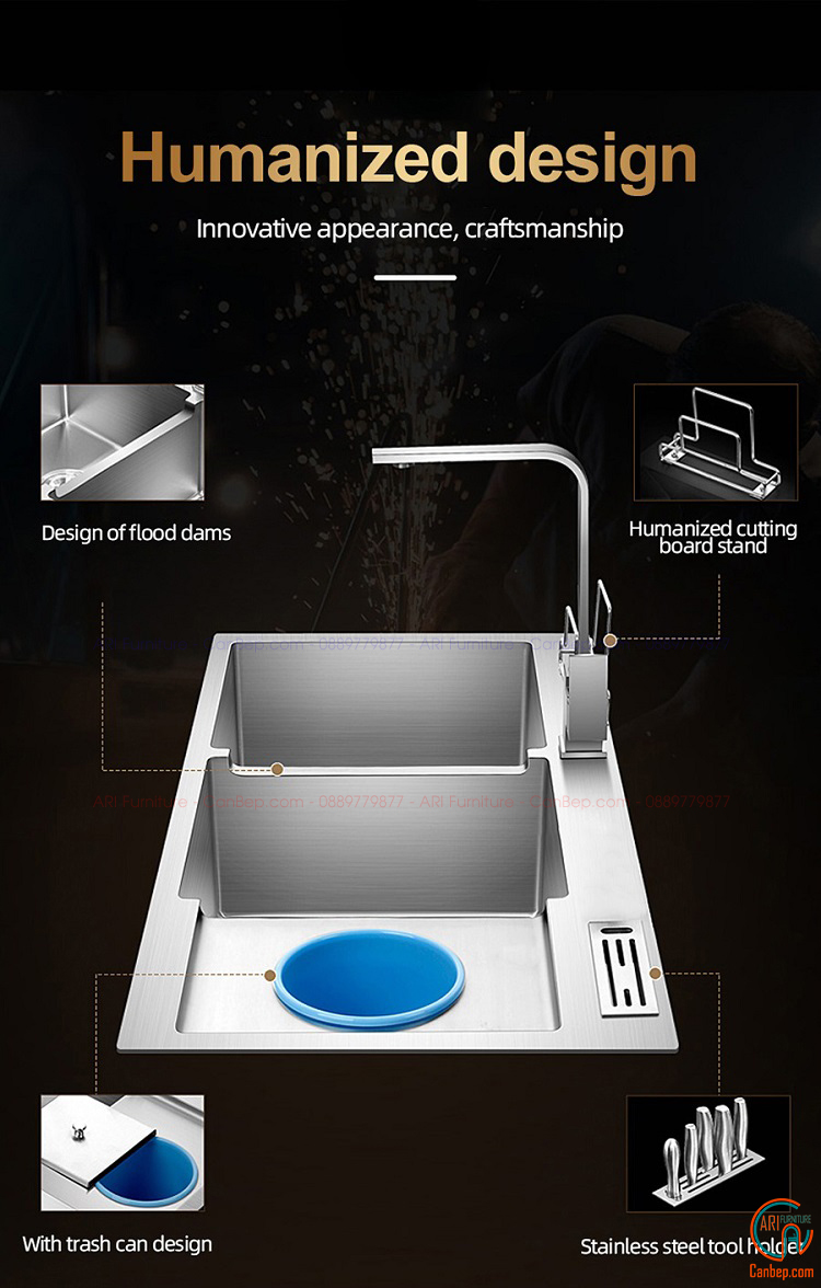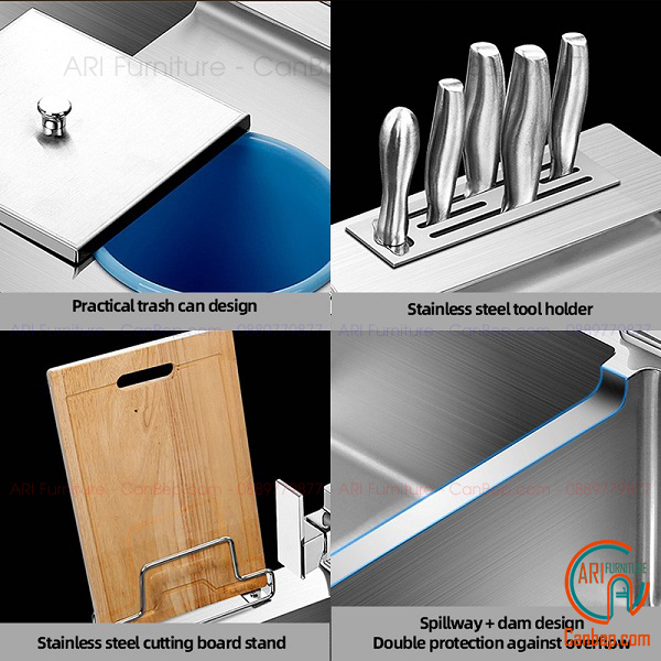 - Khi lắp đặt Chậu rửa chén cần trít silicon kỹ trên bề mặt tiếp xúc của chậu và bàn đá để tránh nước chảy từ thành chậu vào trong tủ bếp, bịt kín đường thoát nước xuống cống để hơi từ cống không bay ngược lên tủ bếp làm tủ bị hôi và độ ẩm cao gây ra hiện tượng hơi nước ngưng tụ trên chậu và trên các mặt dễ bám trong tủ bếp. Không đặt các vật dụng còn ướt vào tủ bếp để tủ luôn khô ráo, nên thiết kế tủ thông thoáng dễ vệ sinh.