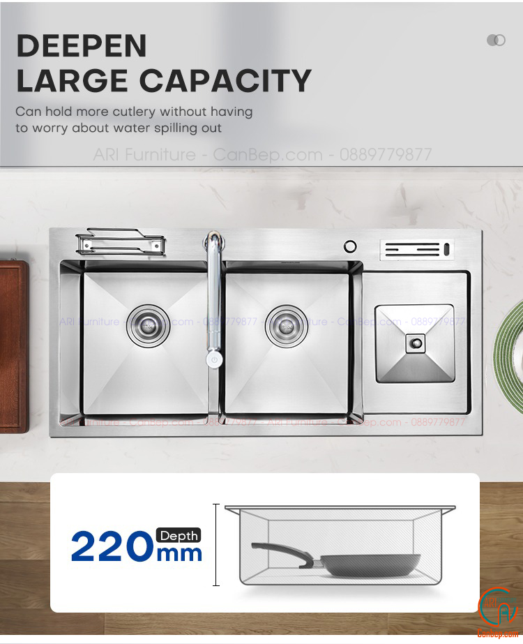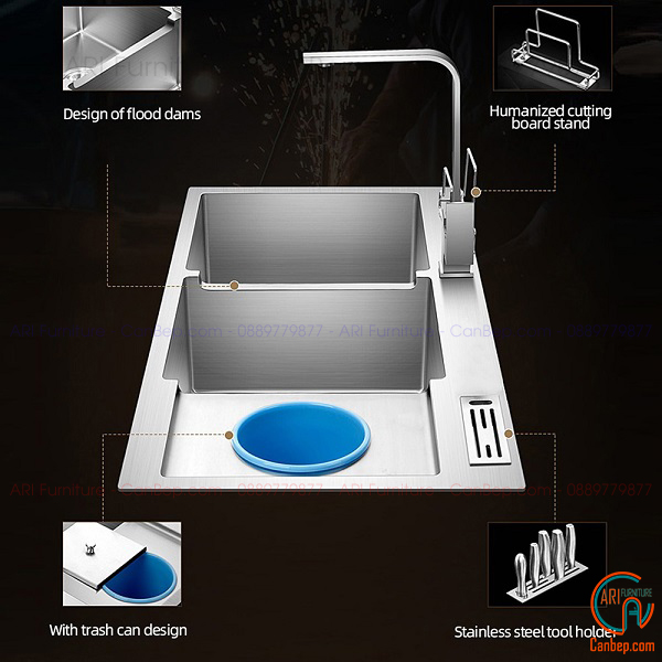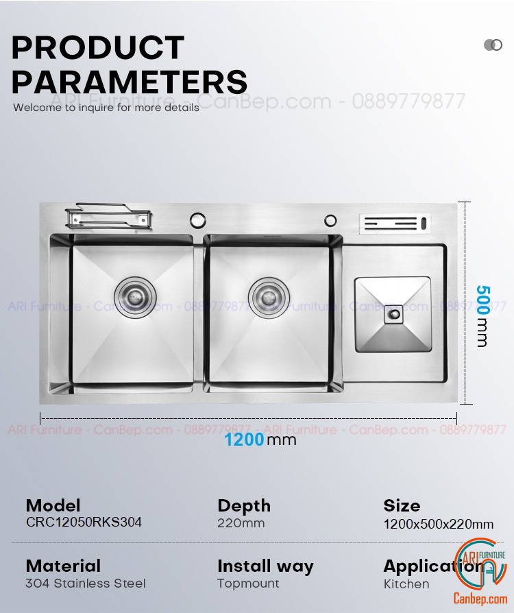 Chậu Rửa Chén 120x50cm Rổ Dao Thớt Dày 2.2mm - inox 304